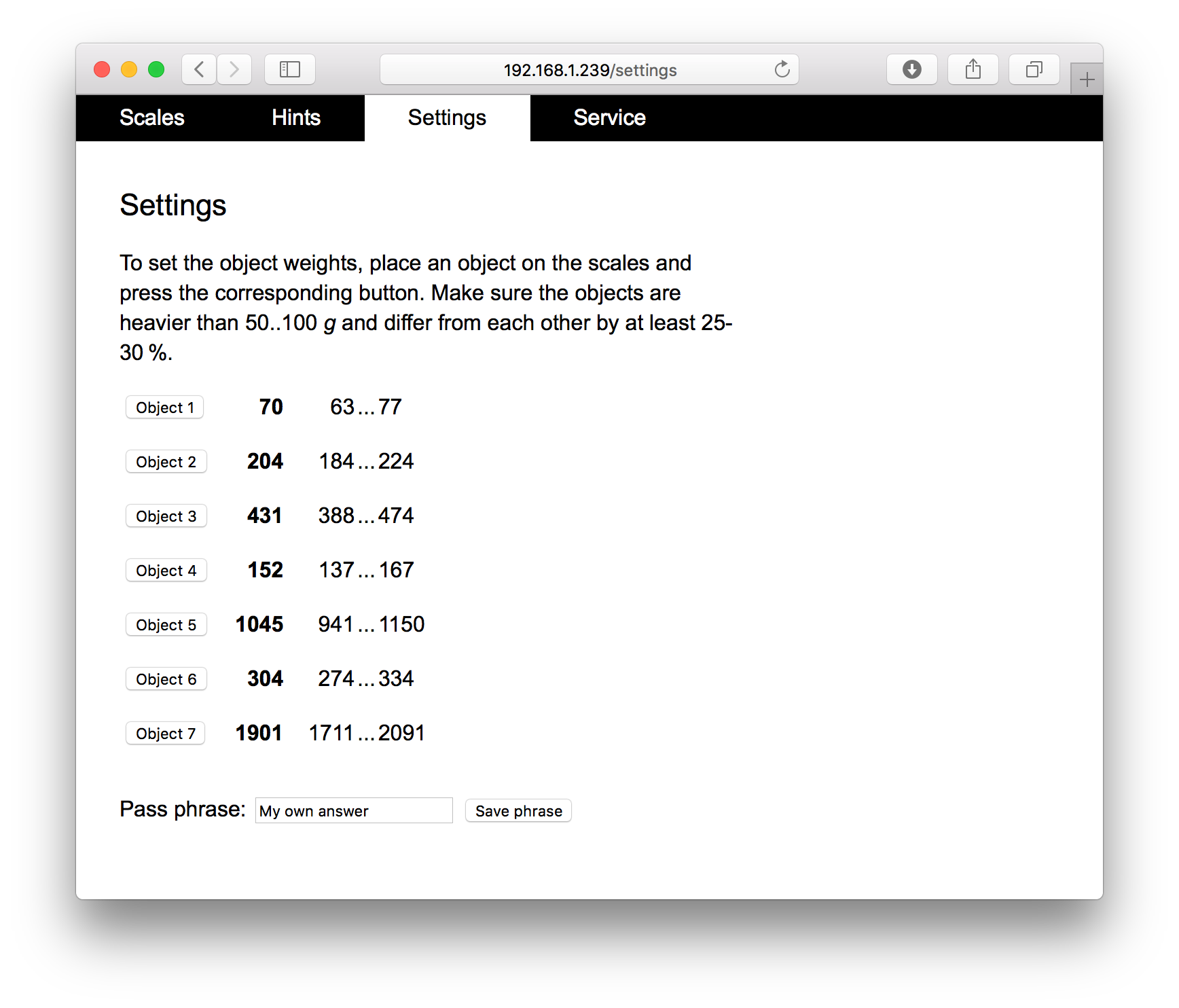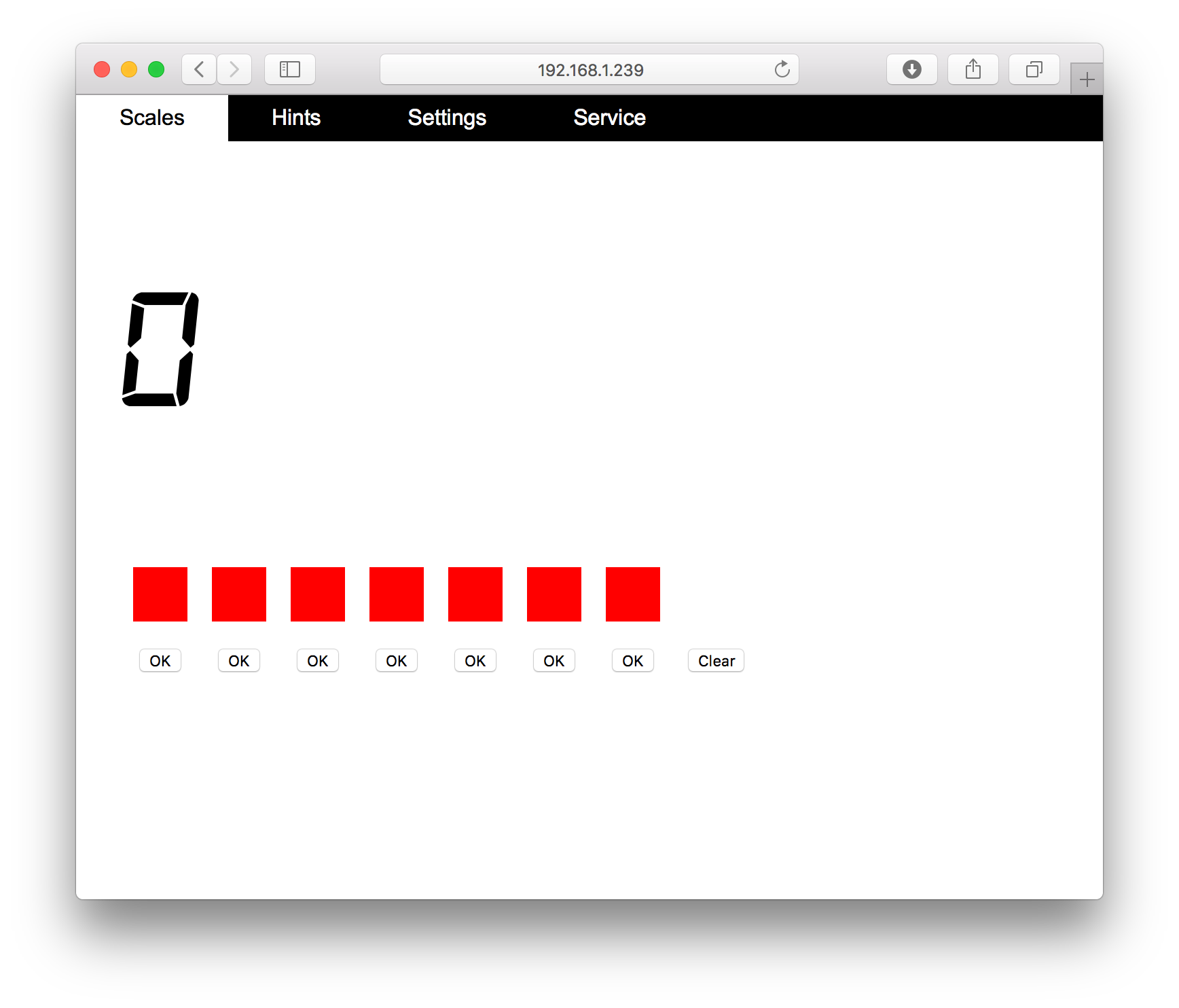 The scales are connected to the local network via Wi-Fi. The web interface allows to control the current state and to set up the devide for the needs of the game. Service pages allow to create custom pre-defined hints that can be sent to the display of the scales. Ad-hoc hints can also be sent at any moment. After all the objects have been weighed, the display shows the secret phrase, which is the key for the next steps in the game script.