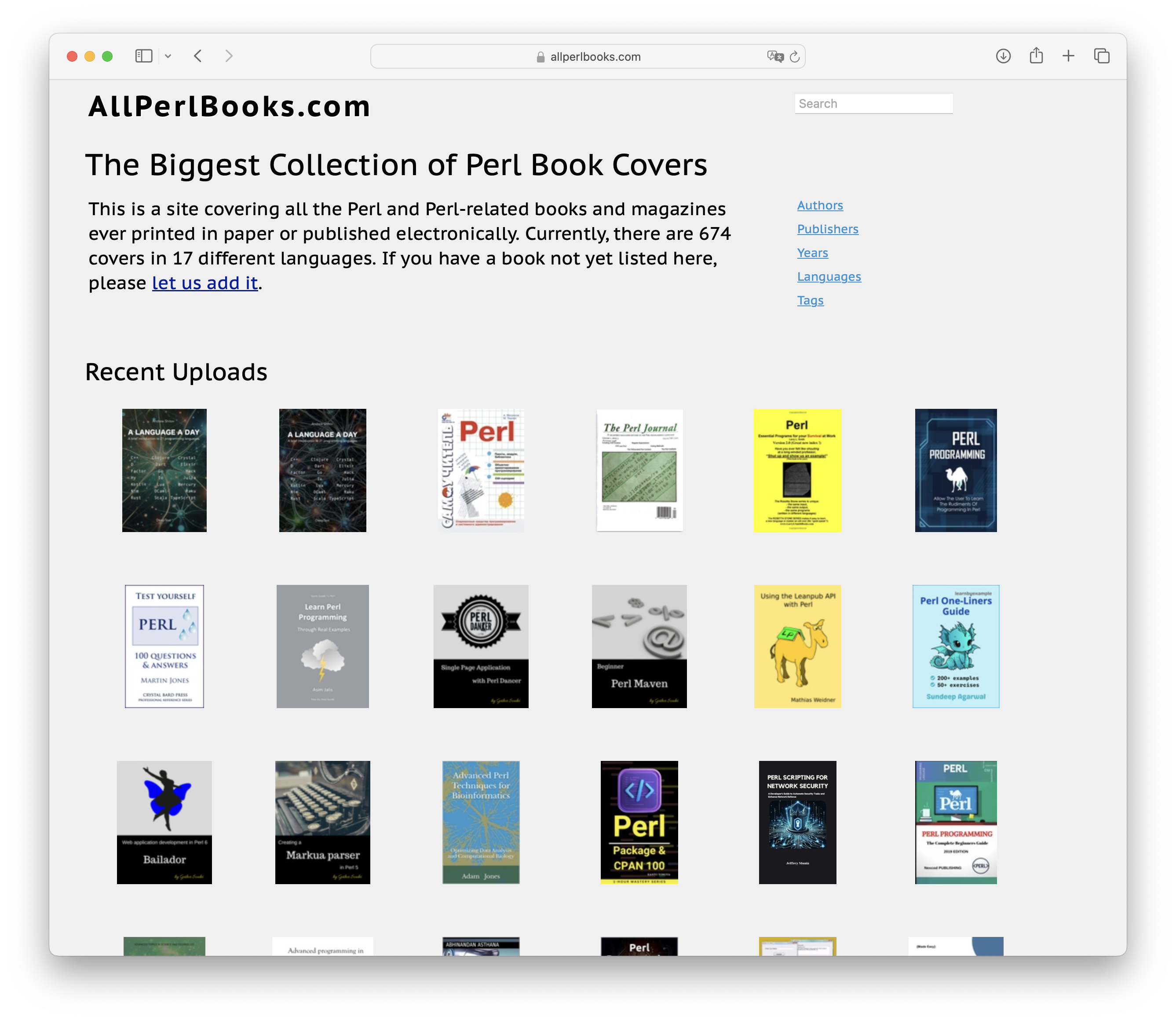 This is a site covering all the Perl and Perl-related books and magazines ever printed in paper or published electronically. Currently, there are 674 covers in 17 different languages.
