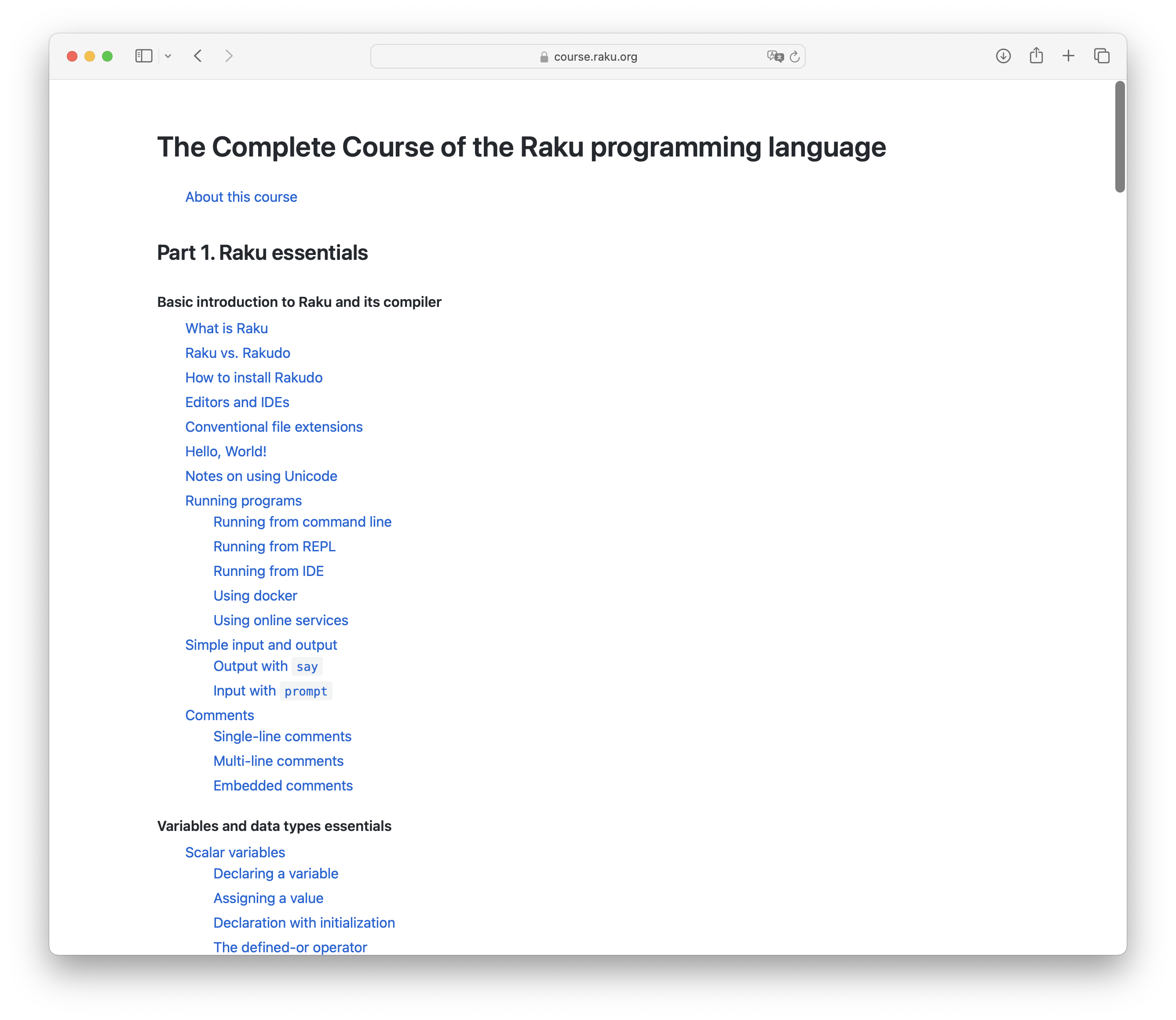If you’re only starting to learn Raku, you are advised to go through all the parts in the order they are listed in the table of contents. If you have some practice and you want to have some specific training, you are welcome to start with the desired section.